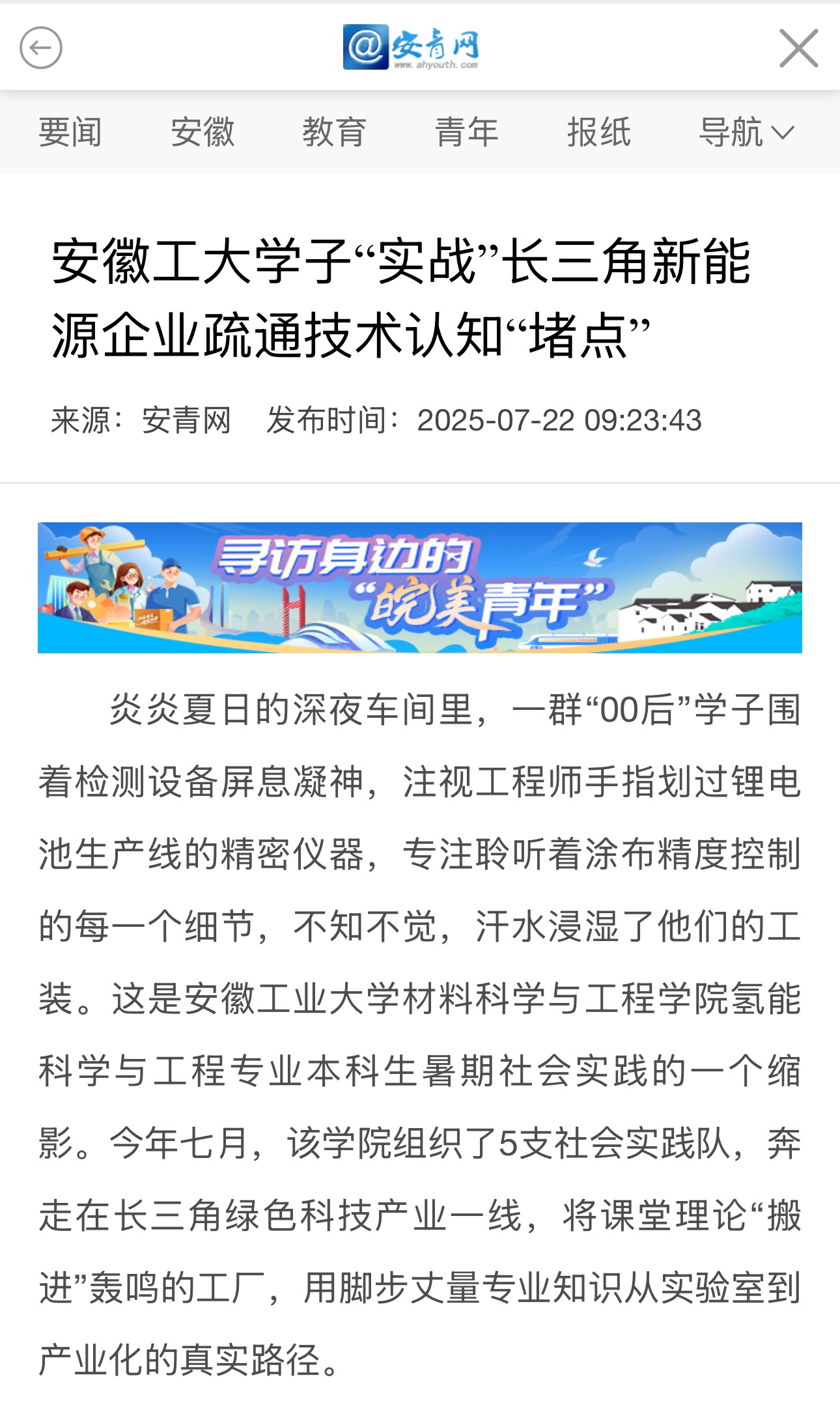 炎炎夏日的深夜车间里,一群“00后”学子围着检测设备屏息凝神,注视工程师手指划过锂电池生产线的精密仪器,专注聆听着涂布精度控制的每一个细节,不知不觉,汗水浸湿了他们的工装。这是H视频 氢能科学与工程专业本科生暑期社会实践的一个缩影。今年七月,该学院组织了5支社会实践队,奔走在长三角绿色科技产业一线,将课堂理论“搬进”轰鸣的工厂,用脚步丈量专业知识从实验室到产业化的真实路径。