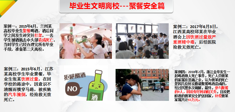 孙老师强调,离校前一是要坚持健康第一、预防为主,毕业生出入校园要遵守防疫规定,不得擅自离马,做好每日健康监测、零汇报,尽早接种疫苗并按时核酸检测,珍惜来之不易的疫情防控成果。二是要加强离校前后防诈反诈意识,毕业生在社会求职中要保持警惕,选择正规渠道求职,加深对网络安全诈骗手段了解和甄别,树立正确的消费观,牢牢捂住自己的钱袋,谨防诈骗。三是强化校园管理,毕业季倡导理性、文明聚会,切勿发生醉酒酗酒、扔砸酒瓶、打架斗殴等不文明行为,确保毕业生文明安全离校。四是以近期多所大学连发多发火灾事件为案例,警示和教育同学住宿期间应严格遵守我校各项规章制度,宿舍内不得私拉乱接电源,不得使用发热性电阻电器,让宿舍消防安全警钟长鸣。会上,孙老师通报了本周宿舍安全隐患排查的结果,对部分宿舍出现的隐患情况进行通报批评,希望大家引以为戒,为大学生涯画上安全的句号。