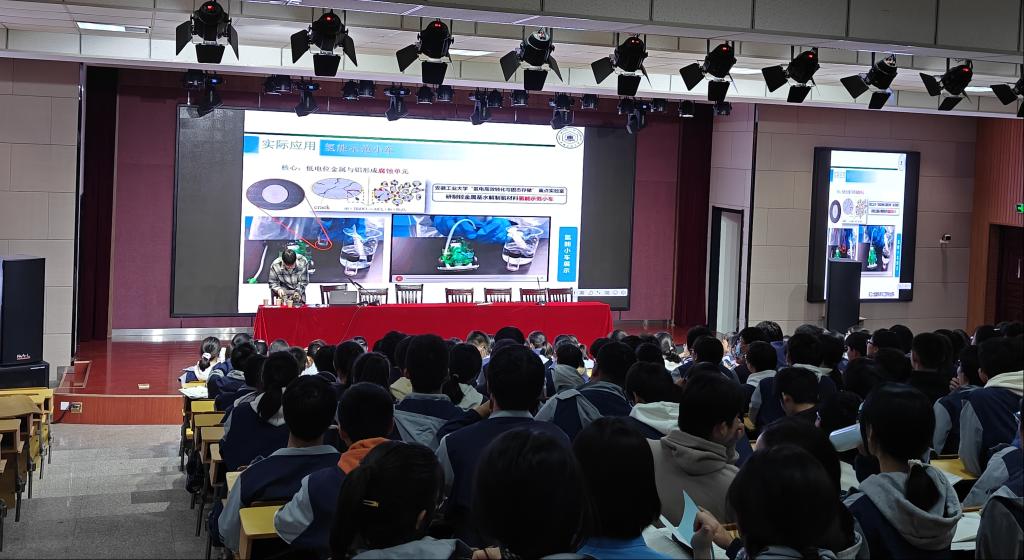的六个特色专业,并讲解了天然材料与仿生材料、形状记忆合金、防冷焊固体润滑薄膜、电极材料与电解质材料、吸波材料以及储氢与制氢材料等前沿成果。任开响向学生们展示了他自制的氢能示范小车,并讲解了从制氢、加氢到启动小车的全过程,这一环节尤其引起了学生们的极大兴趣。通过这些互动和实践环节,讲座不仅传递了知识,还增强了学生们对新材料科学的认识和兴趣。