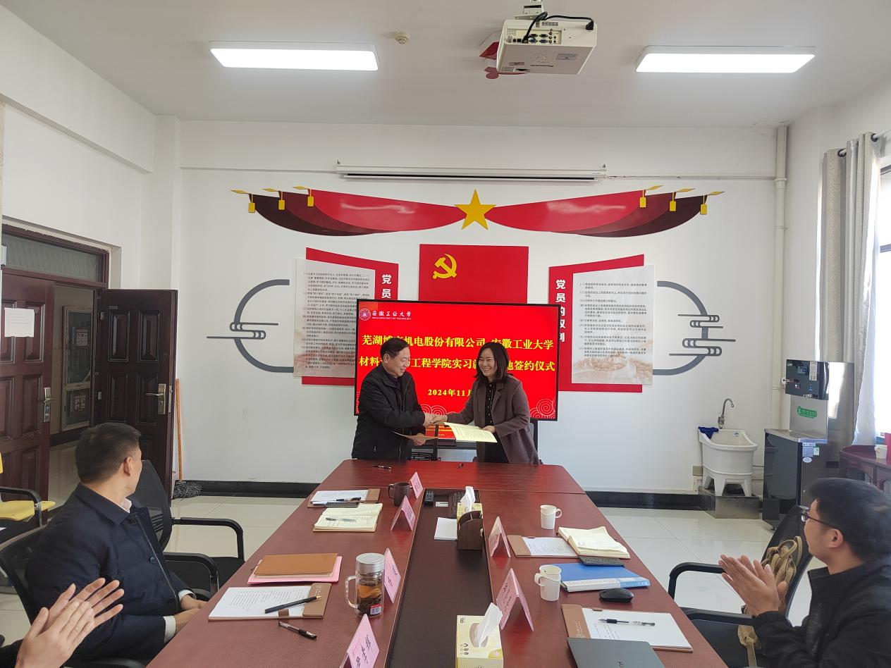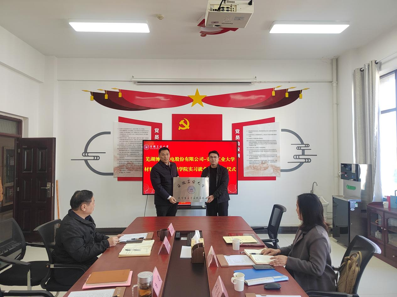 与芜湖博康机电股份有限公司在材料南楼405会议室召开座谈会,双方签订了校企合作就业实习实践基地协议并进行授牌。芜湖博康机电股份有限公司设计总监邱亮亮,芜湖博康机电股份有限公司人力资源总监刘燕,H视频