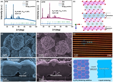基于此,该团队借鉴传统陶瓷领域中的液相烧结方法,在多晶正极材料合成过程中引入低熔点共晶液相,其一方面提升了颗粒尺度的致密性,另一方面引入了掺杂剂(Li),起到了“一石二鸟”的作用。此外,研究人员还发现,烧结过程中材料的晶格参数的各向异性变化也是导致材料颗粒尺度破碎的重要原因。基于这一设计,研究团队开发的NaLi0.05[Ni1/3Fe1/3Mn1/3]0.95O2多晶正极表现出良好的颗粒致密性,振实密度得到了较大提高,比表面积得到了降低。